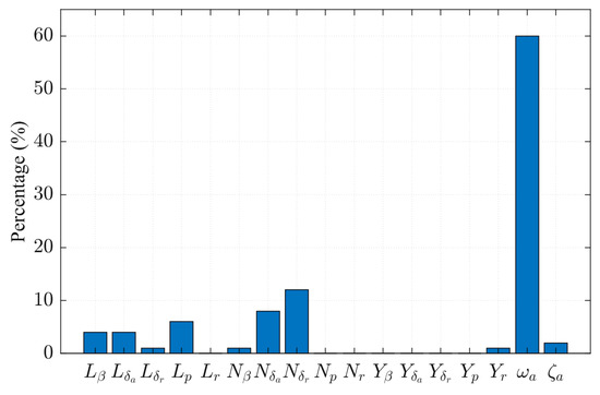 In the control allocation module, a hard cross-connection method [7] is employed to effectively decouple the control coupling between the aileron and the rudder. By referencing the control input matrix in Equation (3), it is possible to reformulate the roll–yaw control coupling matrix as follows: