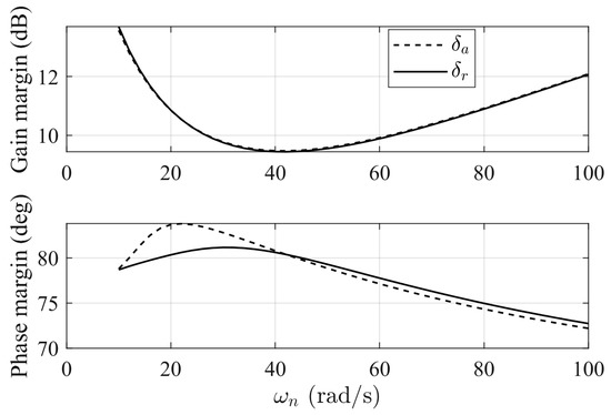 With regard to the roll mode dynamics described in Equation (25), the selected maximum absolute value for the aileron deflection angle is 5 degrees. The reference model and error controller gains are chosen as 8 and 10, respectively.