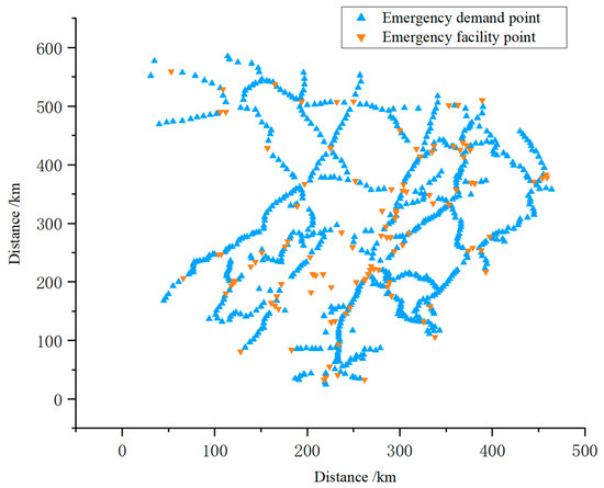 Since alternative emergency facility sites are also subject to the possibility of emergencies, we consider alternative emergency facility sites as emergency demand points as well. On the basis of the abstraction of the railroad network, we abstract the emergency demand points (demand points include stations and lines along the line) and mark the corresponding numbers, stations and coordinate locations. A total of 111 emergency facility alternative points and 797 emergency demand points were abstracted, and their specific distribution is shown in Figure 3. As shown in Figure 3, the actual route data are based on the actual data, but the actual data involve state secrets and are difficult to apply. In order to better promote the model theory, simulated data will be adopted.