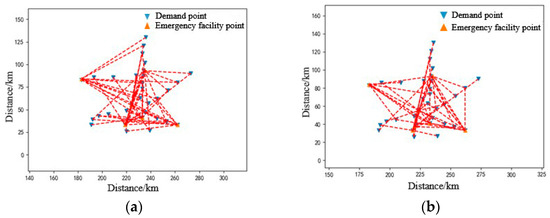 As seen in Figure 5, the red dotted line represents the demand point service relationship. (a) Ω = 6; (b) Ω = 16. When the safety parameter Ω = 6, the optimal solution of the elliptical robust model appears at this time, and the total emergency rescue mileage of the whole system is 66.68 km. When the safety parameter Ω = 16, which indicates that the decision makers are more pessimistic about the risk of demand fluctuation, the elliptical robust model at this time yields the longest total emergency relief mileage for the whole system, which is 133.13 km, and the obtained emergency siting road network topology is more resistant to the risk of demand fluctuation. When decision makers consider that the risk of demand fluctuation tends to be pessimistic, the corresponding safety parameter Ω is larger; when the emergency facilities are more conservatively sited, the ability to resist the risk of demand fluctuation is stronger, but the total emergency rescue mileage of the system is relatively larger; and when decision makers tend to be optimistic considering the risk of demand fluctuations, the corresponding safety parameter Ω is small, and the total system emergency rescue mileage is relatively small. Therefore, our model uses the safety parameter Ω to measure the risk appetite of decision makers, and the appropriate safety parameter can be selected according to the degree of risk appetite and specific reality in the model application to achieve a systematic balance of risk resilience and rescue mileage optimization.