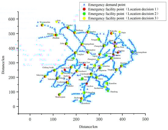 To compare the most available decision results under different maximum overcoverages, a comprehensive analysis is conducted for the three siting decisions corresponding to the shortest rescue mileage in Table 4, as shown in Table 6. The distribution of emergency facility points corresponding to different siting decisions is shown in Figure 6.