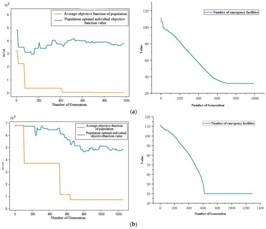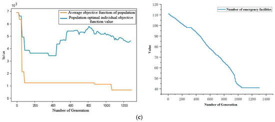 As shown in Figure 7a, the objective of minimizing the total emergency rescue mileage of location decision 1 is obtained after the 691st iteration of the population. The algorithm converges for the first time in the 31st iteration, for the second time in the 88th iteration and for the third time in the 421st iteration; the relationship between the number of railway hazardous-cargo emergency facilities and the number of iterations shows that the number of railroad hazardous-cargo emergency facilities decreases in the first 690 iterations and gradually converges with the optimal solution. That is, the number of RDGT emergency facilities with the smallest total emergency rescue mileage.