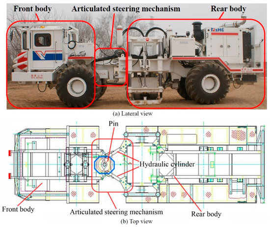As shown in Figure 1, the vibroseis truck is composed of a front body, a rear body, and an articulated steering mechanism. The articulated steering mechanism has the advantages of low energy consumption, large traction force, and simple structure. In the steering process, the stroke difference and arm difference of the hydraulic cylinders of the articulated steering mechanism make the rear body and front body generate a relative deflection and angle for steering.