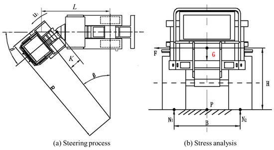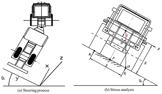 During the steering process on a slope, the resultant force along the slope cannot provide the centripetal force needed for the steering because of influencing factors such as roll angle, self-structure, and gravity, which leads to a rollover accident. The steering process on the slope is shown in Figure 6. When the vibroseis truck is in a rollover critical state, the support force N1 is equal to zero. By calculating the moment for point O, the following equilibrium equations can be obtained: