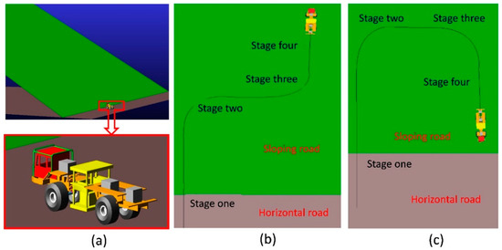 To analyze the driving process of the vibroseis truck on a sloping road, a simulation analysis model, a lateral slope road upward turning analysis, and a sloping road downward turning analysis were established, as shown in Figure 8a–c, respectively. As shown in Figure 8b, the process of turning upwards on a sloping road involves driving on a horizontal road to a sloping road (stage one), going straight on the slope and turning to the right (stage two), going straight up the slope and turning upwards (stage three), and turning up the slope and going straight (stage four). As shown in Figure 8c, the downward turning process on the sloping road involves driving on the horizontal road to the slope road stage (stage one), going straight up the slope and turning to the right (stage two), turning straight on the slope and turning downward (stage three), and going straight down the slope (stage four). In the simulation, the driving speed was 7 m/s (25.2 km/h), the maximum steering angle was 25°, and the slope angle was 15°.