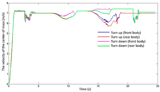A comparative analysis of the speed changes of the front and rear bodies of the vibroseis truck during the upward and the downward steering on the lateral slope was carried out to determine the changes in the speed of the vibroseis truck during the turning process. The speed comparison curve of the front and rear car bodies is shown in Figure 9.