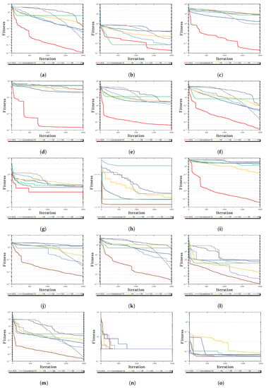 Comparison results of the benchmark function: (a) f1; (b) f2; (c) f3; (d) f4; (e) f5; (f) f6; (g) f7; (h) f8; (i) f9; (j) f10; (k) f11; (l) f12; (m) f13; (n) f14; (o) f15; (p) f16; (q) f17; (r) f18; (s) f19; (t) f20; (u) f21; (v) f22; (w) f23.