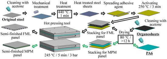 In the 1980s, an FML based on resin matrix composites was developed, which was successfully used in the wings of the large passenger aircraft A380 due to the combined high strength of metal layers with the lightweight characteristics and high fatigue resistance of composites [1,2,3]. Their research and development have expanded in both the automotive industry and the aerospace sectors. Some of the traditional FMLs are GLARE® (Al/glass–fibre–resin/Al), ARALL® (Al/aramid–fibre–resin/Al), and CARALL® (Al/carbon–fibre–resin/Al) [4], which mainly consist of aluminium alloy sheets and different fibre-reinforced resins. They are produced mostly by curing of the fibre-reinforced epoxy resin into panel structures. In industrial applications, their singular structures and time-consuming production processes limit their mass production and application in the automotive industry. In contrast to FML, another type of sandwich material containing thermoplastic polymer core without fibre reinforcement, i.e., metal/polymer/metal (MPM), was developed in the last two decades. These are lightweight and offer significant forming potential, as well as outstanding thermal and acoustic isolation properties. However, the reduced absolute strength and stiffness values—especially with the higher volume fractions of the core—are the main drawbacks. Alucobond®, Dibond®, Hylite®, Litecor®, and other examples of this category are mainly used in automotive structures such as the roof and door structures of the Volkswagen Lupo and Audi A2 [5]. In order to enhance the stiffness of these sandwiches while keeping their outstanding lightweight potential formability, thermoplastic-based FMLs have been developed [6,7]. For this purpose, different cover sheet materials have been applied, e.g., steel [8], which is gaining more and more attention due to its good formability and cost advantages. In contrast, thermoplastic polymer matrices such as PP (polypropene), PA6 (polyamide 6), PEEK (polyetheretherketone), and PU (polyurethane) have been considered, such as glass fibre-reinforced polymers (GFRPs) and carbon fibre-reinforced polymers (CFRPs). The Leika® project, for example, developed a forming technology of thermoplastic-based FML containing steel/GF-PA/steel, which have weights reduced by around 25% compared to the use of monolithic steel sheets [9]. Other sheet-like thermoplastic-based FML products have been developed, such as CAPAAL® (Al/carbon–fibre–PA6/Al) and CAPET® (titanium/carbon–fibre–PEEK/titanium) [10].