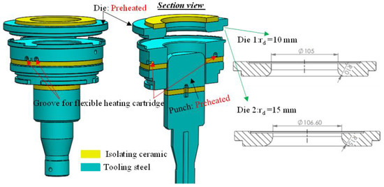 For this research, the test conditions for sheet deep drawing are summarised in Table 2. The diameter of the blank and punch, the punch radius, and the test speed were kept constant, while the die radius, holding force, and forming temperature were varied. Two dies with radii of ten and fifteen millimetres and separate inner diameters were prepared (see Figure 3). In order to obtain the predesigned temperature, the test machine was modified; the blank holder was equipped with heating cartridges to provide the required forming temperature. In addition, the samples, punch, and die were preheated in an external furnace to 20 °C above the predesigned temperature to compensate for the temperature loss occurring during their transfer. It should be mentioned that these three tool components were separated from the machine by means of insulating ceramics to avoid excessive heating of the machine and to maintain the temperature in the sample. The forming temperatures were adjusted at 235 ± 5 °C and 200 ± 5 °C; herewith, (quasi) isothermal warm forming could be assumed and considered. For further results, the real-time temperature progress is depicted in [31].