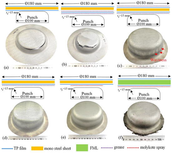 - Furthermore, the lubrication settings for the warm deep drawing of the monolithic steel sheet and FML were found to be similar to those at RT, where only the TP film and grease were replaced by a Teflon film (0.05 mm) and Molycote spray (graphite based), as shown in Figure 4e,f.
