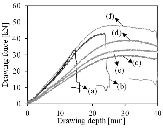 Force–displacement curves of TS290 with different lubrication settings for the deep drawing conditions (a–f) shown in Figure 4.
