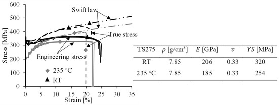 To comprehend the deformation behaviour of organosheet RG and FML under deep-drawing conditions, finite element analysis via Abaqus/Explicit was introduced. The plastic response of steel-grade TS275 was modelled by assuming isotropic hardening, but in this case, the damage criterion to simulate the fracture behaviour was not given. The plastic properties of TS275 were extrapolated according to Swift law. Figure 6 shows the relationship between flow stress and plastic strain for TS275 at RT and 235 °C, as well as the other properties, namely, the density (), E-modulus (), Poisson’ ratio (), and yield strength (). The corresponding data were obtained from the experimental stress–strain curves in Figure 1b. Moreover, the influence of the strain rate on the mechanical properties of the steel sheet could be ignored. The difference between the tensile strengths from 0.04 s−1 to 0.004 s−1 was minor for this kind of mild steel (TS275), a result which was published in the previous study [33]. The test speed for the deep-drawing (0.5 mm/s) and tensile tests (0.64 mm/s) were at the approximate magnitude, same for the characterization of organosheet and PA6. In this study, the simulation of deep-drawn FML was performed at 200 °C, where the difference in mechanical properties between 200 °C and 235 °C was neglected. More results on the mechanical characterization of this organosheet and PA6 regarding the temperature were published in [34], in which the same organosheet was considered. Thus, RG was modelled as an anisotropic elastic material with nine engineering parameters, (E-moduli in their respective directions); (Poisson ratios in their respective directions); and , and (Shear-moduli in their respective directions), whose values at RT and 200 °C were obtained from [33,34] (see Table 5). The density of RG was 1.8 g/cm3.