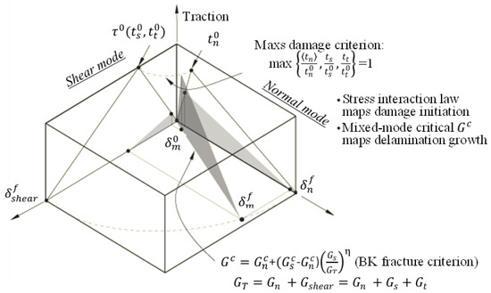 Furthermore, the interfacial contact behaviour between the layers of FML was modelled using three separate approaches. First, it was modelled using cohesive elements (COH3D8) based on nominal stresses and energies, which were defined in terms of traction separation, i.e., mixed-mode delamination (see Figure 7). The maximum normal stress damage initiation criterion (Maxs) and the Benzeggagh–Kenane (BK) damage evolution criterion were used, respectively. For the damage initiation criterion in this figure, represent the normal and the two shear tractions; and represent the peak values of the nominal stress when the deformation was either purely normal to the interface or purely in the first or the second shear direction, respectively [35]. For the damage evolution criterion, represent the work done by the tractions and their conjugate relative displacements in the normal, first, and second shear directions, respectively, and is the total energy release rate. Moreover, specify the effective displacement at complete failure and that relative to the effective displacement at the initiation of damage, respectively; is the energy dissipated due to failure; and is a material parameter [35].