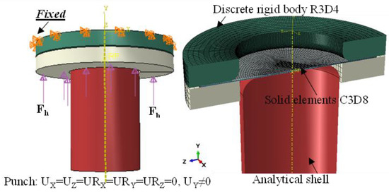 The dimension of the round sample in the simulation model was 180 mm in diameter. The upper surface of the die in the model was fixed, and a holding force was applied to the lower surface of the holder. The sample was compressed by the holder under this load, and once the punch began to move, the sample was able to slide inwards between the die and the holder (see Figure 8). The element type of the sample was chosen as Hex by default, and the meshing was performed using the sweep technique, which includes 8-code solid element C3D8 with an element size of 2 mm, for which the mesh analysis was converged [31] The punch was idealised as an analytical shell and the die was a discrete rigid body (R3D4) with a mesh size of 5 mm; the die edge area was refined to a 1 mm element size to avoid unsmooth contact between the tool and the sample. Interactions between the sample and the model were defined as general contact interactions, set with a Coulomb friction coefficient of 0.05.