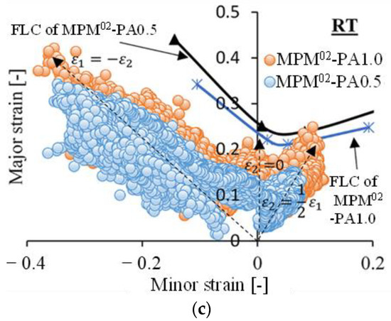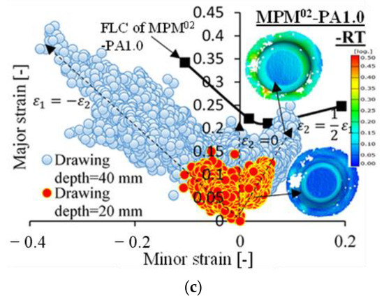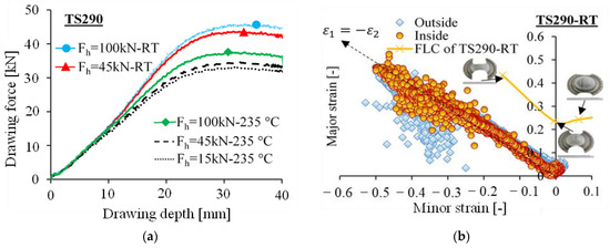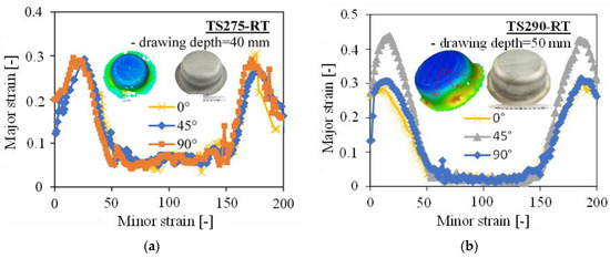 In Figure 9b, the strain evolution on both sides of TS290 at RT with major () and minor () strains converging to was similar to the pure shear deformation behaviour in the Nakajima test [39]. By means of the FLC curve for TS290 at RT (marked with a yellow curve), it can be judged that the strain distribution on the steel sheet remained within the safety zone up to a drawing depth of 50 mm. This highlights the good and deep drawability of the steel sheet TS290, and that the strain evolution on both of its sides was almost identical. The FLC curves in Figure 9b, as well as the ones in the following figures, were all determined at a test speed of 1.5 mm/s in the previous study [31].
