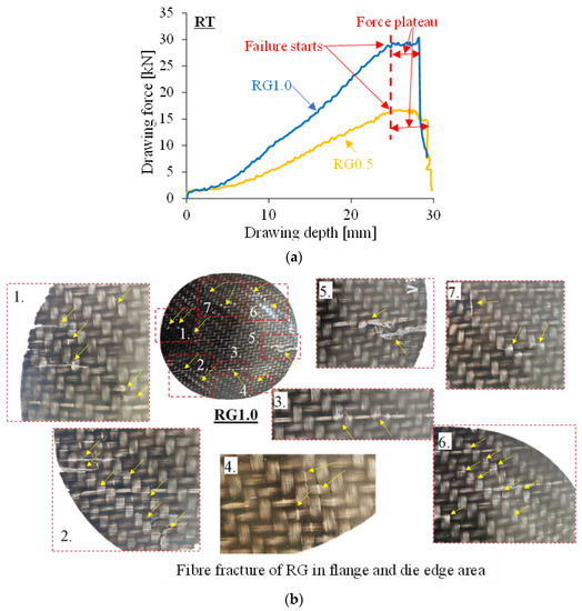 - At RT, the deep-drawability of RG is limited by failure in the flange and die edge regions, attributable to in-plane tangential deformation and fibre compression fracture due to the acting circumferential compressive stresses;