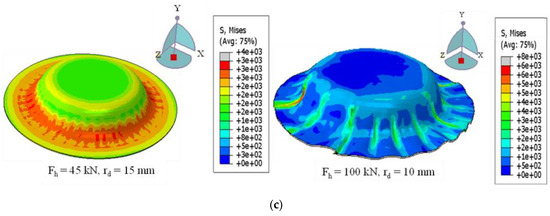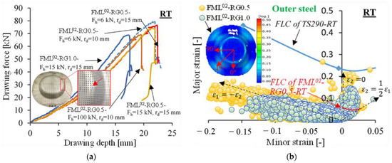 At RT, the drawing force of the FML under deep-drawing conditions decreased with the increasing die edge radius, and the slope of the force–displacement curve increased significantly with increasing core thickness. Basically, the higher slope refers to higher strengthening potential, as shown earlier through the uniaxial tensile test in Figure 1. However, the maximum drawing depth and the corresponding maximum drawing force decreased, as expected [41], as shown in Figure 14a. With a thicker core layer, the tensile stress applied to the outer steel sheet at the punch edge was greater, as was the cracking probability, as shown in the sample image. Adjusting the process parameters and the thickness ratio did not lead to a change in the maximum stroke of the FML, which was limited to less than 25 mm.