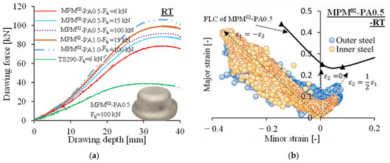 According to the experimental plan, the effect of the core layer PA6 on the deep drawing of the sandwich panel was investigated subsequently. If only one variable, i.e., the core layer thickness, was varied, it could be observed that the drawing force increased with increasing core thickness. In addition, the MPM demonstrated good drawability in the range of 6 kN to 100 kN, with no remarkable defects such as wrinkling or cracking, indicating the large flexibility of the MPM’s working window under deep-drawing conditions, as shown in Figure 12a. However, due to the high tensile stresses exerted by the soft polymer core on the outer steel sheet, the MPM showed differences in the strain evolution of the inner and outer steel sheets compared to that of the monolithic steel sheets. As shown in Figure 12b, the outer steel sheet of MPM02-PA0.5 gained further extension in the 0 and directions, which corresponded to the plane strain and biaxial tension states in the Nakajima test, respectively [39]. In the direction, on the other hand, the strain evolution was similar to that of the monolithic steel sheet. This phenomenon became more pronounced as the thickness of the core layer increased, as can be seen in Figure 12c. It can be observed that the strain of the outer cover steel sheet in the direction for MPM02-PA1.0 exceeded its corresponding FLC curve, indicating a much higher probability of cracking. The MPM02-PA0.5, on the other hand, showed a strain distribution that was still within the safety zone compared to the corresponding FLC curve. Therefore, the formability of the MPM decreases with increasing core thickness.