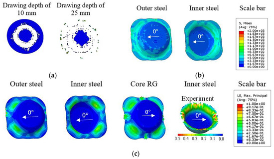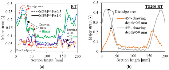The strain distribution of a cross-sectional line through the centre pointof the drawn cups enabled further analysis of the effect of the core layer PA6 on the strain evolution of the sandwich panel. Firstly, the major strain values were compared for the drawing depths of 20 and 40 mm. It can be seen that at a drawing depth of 20 mm, the strain evolution first appeared in the area of the punch edge (in the range of approx. 50 to 150 mm along the section line). Subsequently, as the drawing depth increased to 40 mm, the strain evolution in the die edge region developed rapidly (see Figure 13a). In contrast, by comparing the strain evolution of TS290 at both drawing depths (25 mm and 50 mm), it can be seen that the maximum major strain values always appeared in the die edge region and doubled as the stroke increased (see Figure 13b). Due to the high tensile stresses exerted by the soft polymer core, the strain evolution of the MPM increased in the punch–edge region and decreased in the die–edge region [13]. Combining Figure 13a,c, it can be concluded that at a 20 mm stroke, the main strain evolution was concentrated at the punch edge, while the corresponding strain distribution was in the direction. It was the acceleration of the strain evolution around the die radius as the stroke was increased that led to the rapid expansion of the strain distribution along the direction in Figure 13c. It can be concluded that the effect of the core layer PA6 on the outer steel sheet of the sandwich is mainly concentrated on the punch edge, i.e., the biaxial tension along the direction. Its influence is secondary to the pure shear deformation and strain evolution of the cover steel sheet at the die edge.