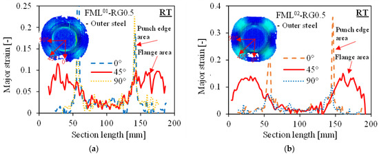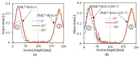 In addition, the strain evolution along the cross-sectional lines showed the differences in the various material combinations and forming temperatures. In contrast to the strain evolution at RT, the strain evolution at 235 °C was significantly extended, as shown in Figure 18a. Although the flange area of FML showed anisotropy at RT, FML01 did not exhibit different strain values in either direction at 235 °C, i.e., reduced anisotropy and homogeneous strain distribution. In contrast, FML02 still showed higher strain values at the die radius edge in the 45° direction. This was mainly because TS290 itself is anisotropic, whereas TS275 is almost isotropic (see the tensile test results in Figure 1a). If the temperature was reduced to 200 °C, the strain evolution along the cross-sectional line differed slightly from that at 235 °C, showing a slightly greater strain evolution in the 45° direction than in the 0° and 90° directions (see Figure 18b). It can, therefore, be concluded that at RT, RG plays a critical role in the formability and strain evolution on the cover of the FML. As the temperature increases, its influence diminishes. Until the temperature is above the PA6 melting point, the anisotropy of the organosheet has a negligible effect on the strain evolution on the steel sheet, which dominates at this point.