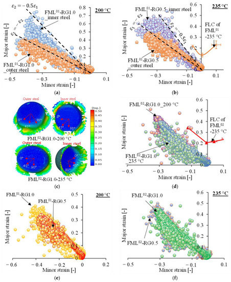 Strain evolution in the outer and inner steel sheets of FML at (a) 200 °C and (b) 235 °C; (c) photogrammetry images; (d) strain evolution in the outer steel sheet of FML at 200 and 235 °C, with different core layer thicknesses at (e) 200 °C and (f) 235 °C.