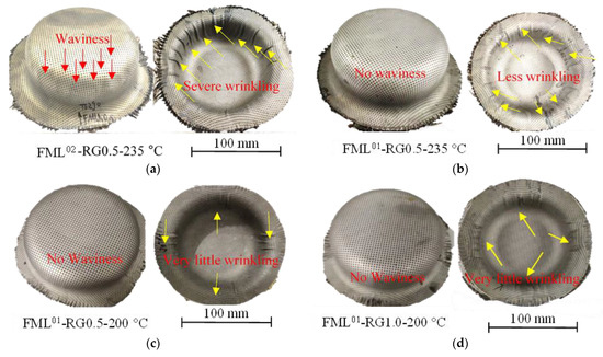 Wrinkling in the flange region and waviness in the sidewall regions of FML after deep drawing at 200 and 235 °C with a drawing depth of 40 mm: (a) FML02-RG0.5-235 °C, (b) FML01-RG0.5-235 °C, (c) FML01-RG0.5-200 °C, and (d) FML01-RG1.0-200 °C.