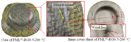 - The minor wrinkling of the inner cover of FML at 200 °C results from in-plane shear and fibre fractures of the RG in the warp and weft directions due to their limited fibre mobility compared to 235 °C;