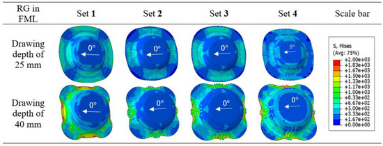 Considering the finite element simulation results, it can also be seen that the FML01-RG0.5 showed no coincident fibre wrinkles in the flange area in the warp or weft directions with the experimental results in the case of the contact condition of Set 1 in Table 7 (see Figure 21). However, by considering the tangential frictional contact behaviour (Sets 2 and 3) and the cohesive contact behaviour between the FML layers at 200 °C, all simulation results resulted in wrinkling in the warp and weft directions of the organosheet RG in the flange and die edge areas. Moreover, the degree of the wrinkling of contact Sets 3 and 4 was more severe than that of Set 2 due to the higher stress values indicated in the simulation images. By comparing the contact of Sets 3 and 4, a significant difference in the stress evolution in the punch edge area was observed, where the stress distribution was more homogeneous in the circular direction, but that of Set 3 showed obvious localization in the warp and weft directions. As the real contact between layers of the semi-finished FML panel could not be simplified as frictional sliding from the beginning of the warm deep-drawing process, the results of Set 4 through mixed-mode delamination of cohesive elements were found to be more reliable.