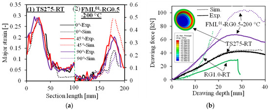 As can be seen in Figure 22a, the cohesive element deletion first occurred at the side wall area at a drawing depth of 10 mm. By further increasing the drawing depth up to 25 mm, the deletion of cohesive elements propagated accordingly to reach the flange area. The laminate lost support from the tool first in the side wall area when the laminate was deep-drawn into the die. With further punch displacement, the flange area of the laminate flowed inwards. Plastic deformation and relative sliding could occur when the adhesion strength between layers was weakened due to the high temperature [37]. As no fibre fracture criterion was defined in the material modelling, the simulation results showed deviation from the experimental ones. Thus, wrinkling of organosheet RG, but not of the fibre fracture, in simulated conditions could be successfully validated by the experiments. By analysing the stress and strain evolution of the inner and outer steel sheets at a punch displacement of 40 mm, it can be seen that the stress evolution of inner and outer steel sheets was homogeneous, which is a different result from the anisotropic organosheet core RG (Figure 22b). Moreover, the strain evolution of RG was localized in the 0°, 45°, and 90° directions in the flange area (see Figure 22c). As was different from the experimental results in terms of the strain evolution of the cover sheets, the simulation showed the anisotropic strain evolution of the inner and outer steel sheets, which was due to the anisotropic behaviour of the core RG. In contrast, the experimental results showed more isotropic strain evolution in Figure 22c, which might have been due to the fibre fracture in the warp and weft directions. In addition, the flow behaviour of the cover sheets in the 0° (warp) and 90° (weft) directions at the flange and die edge area changed. Thus, the influence of anisotropic RG was minimized and the nature of TS275 itself dominated at 200 °C. To interpret the different strain evolution results between the experiments and the simulation, cross-sectional strain analysis was carried out as shown in in Figure 23a. As can be seen, the simulated strain evolution of the outer steel sheet in FML01-RG0.5 at 0° and 90° was significantly lower than that oneat 45° and at 200 °C, which was obviously different from the experimental one in Figure 18b. However, the simulation result of the monolithic steel sheet TS275 matched with the experimental one very well. In addition, the force evolution indicated that the simulation result of monolithic RG at RT and FML01-RG0.5 at 200 °C deviated significantly from the experimental results at drawing depths of 10 mm and 15 mm, respectively (Figure 23b). The reason may be the fact that the fibre degradation and damage criterion were not implemented in the simulation model. However, the simulation results coincided with the experimental result of monolithic TS275 very well. Based on the current simulation techniques, further modelling and simulation studies in terms of damage initiation and evolution of the organosheets are necessary, and will be performed in the extension of the current project. Moreover, the influence of temperatures and strain rate on the material properties could also be taken into account and embedded into the simulation model if necessary.