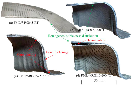 Finally, the thickness distribution and the macro-defects of the deep-drawn FML at different forming temperatures were qualitatively investigated. The thickness distribution was homogeneous at RT in the FML01-RG0.5 (Figure 24a) and remained uniform while forming at 200 °C, along with substantially improved formability, as shown in Figure 24b. However, at 235 °C, a significant thickness irregularity was observed, together with a thinning of the core material in the punch edge and flange regions and a thickening in the wall area (Figure 24c). This was due to the flow of the softened and fluid polymer matrix. This caused problems such as wrinkling, waviness, and unavoidable thickness irregularities. Based on this, it can be stated that forming at a temperature of 200 °C (< melting point of the polymer matrix) is more appropriate for ensuring good formability and improving the quality of the deep-drawn parts. With warm deep drawing, delamination can also occur after the cooling process if there is no counterpressure to the punch in the sample bottom region, as in Figure 24d. This is due to the lack of pressure at the die bottom as well as the different coefficients of thermal expansion of the core and cover layers, which can lead to a reduction in adhesion and separation while sawing the drawn cups.