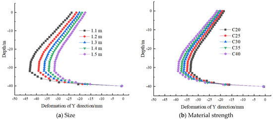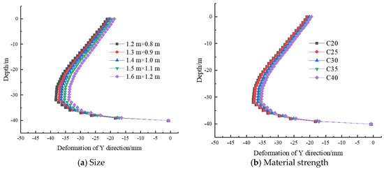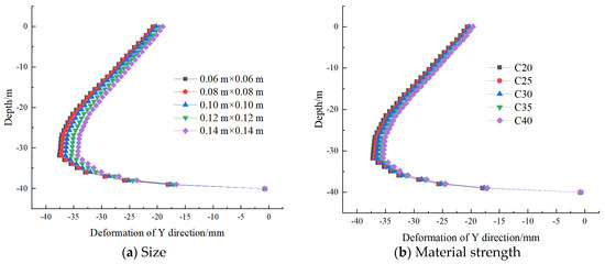 - The size and material strength of the waist beam and crown beam have negligible influence on the horizontal deformation of the pile. However, increasing the size and material strength of the pile significantly enhances the overall stiffness of the retaining structure, thereby reducing the horizontal deformation of the pile. Therefore, improving the size and material strength of the pile is crucial in minimizing the deformation of the retaining structure.