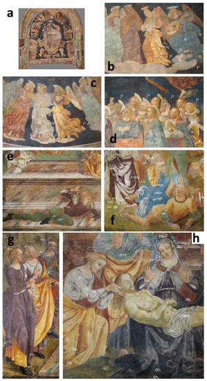 Pictures of the analyzed scenes and investigated points: (a) panels on the vault; (b–d) analyzed points on the vault; (e) the Resurrection, details of investigated points; (f) Garden of Olives, investigated points; (g,h) the Resurrection, details and investigated points.