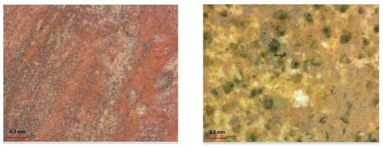 The investigated areas were chosen together with the art historians and conservators examining the results of previously performed imaging analyses—both to have a complete picture of the original and added materials and to answer specific questions. In general, typical pigments of mural paintings were detected. Indeed, yellow and brownish hues were obtained by iron oxides and/or hydroxides, as well as red pigments, which constituted mostly of iron oxides. Only in a few cases were the red details executed by using vermillion, as, for instance, the darker vests seen in the A and E panels [1]. This pigment is easily recognized based on Raman spectra and from the presence of mercury in the XRF ones. In the left box, in Figure 2, the digital optical microscope image of a vest painted with vermillion in panel A is reported.