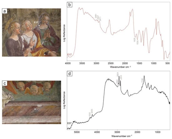 On the gold gildings, the ER-FTIR revealed the use of lipidic material (i.e., oil), likely used to adhere the gold leaf to the surface. On the spectra acquired on all analyzed panels, sharp and intense signals with a derivative shape relative to ν(CH2/CH3) stretching appear at ca. 2930 and 2860 cm−1, along with a weaker shoulder at ca. 2960 cm−1, as well as the derivative band at ca. 1750 cm−1 due to the carbonyl asymmetric stretching band [14]. Moreover, in the near-infrared region, the peculiar doublet was detected due to the combination of methylenic C–H stretching and bending at ca. 4345 and 4255 cm−1 (Figure 3d) [31]. As highlighted by the multiband imaging investigations [17] in specific areas, the presence of organic material allowed us to map the original presence of the gildings, which were also on some dresses and veils. Indeed, all these areas are characterized by a yellow–orange fluorescence in the UVF (ultraviolet fluorescence photography) images [17] due to the presence of organic material and, namely, the lipidic fraction of the so-called missione used to make the gold adhere. The missione is the preparation (and sticking) layer of the gildings, made using linseed oil and small quantities of pigments. This type of mapping allowed us to recognize the former presence of gildings in several other areas, such as in the rays that leave the angels in the Resurrection scene (panel D).