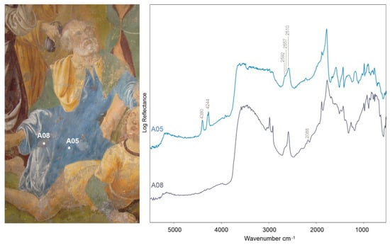 ER-FTIR spectra, acquired on a figure with the blue clothing on panel A, reveal the spectral evidence of azurite in the original area (A05) and Prussian blue in the restored part (A08).