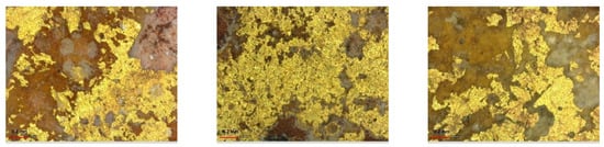 The gildings displayed a presence of gold X-ray characteristic lines, Lα and Lβ, in the XRF spectra, respectively, at 9.71 keV and 11.44 keV, and also in those areas where they are no longer visible to the naked eye. Some of these areas, if observed by a digital microscope (see Figure 5), show the presence of residual islands of gildings.