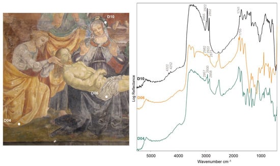In addition to the gildings, traces of oils were detected in most of the spectra acquired on panels A, E, and D, highlighted by the bands at ca. 4345, 4255, 2960, 2930, 2860, and 1750 cm−1 (Figure 6).