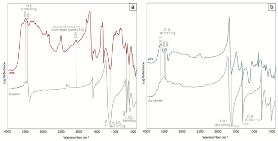 ER-FTIR spectra acquired on panel A show the spectral evidence of Ca-sulfates (a) and Ca-oxalates (b). Reference spectra [22] were also reported for comparison.