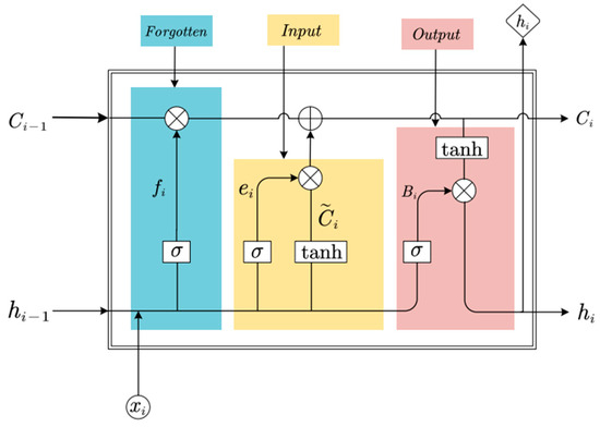 LSTM is a special type of recurrent neural network (RNN) that performs very well with long sequences of data, mainly solving gradient disappearance, gradient explosion, and overfitting problems when training long sequences [40,41,42,43]. RNN is an artificial neural network that operates on time-series data and can use back-propagation algorithms to learn and adapt to the relationship between inputs and outputs. In contrast to standard RNN, LSTM has an input gate, a forgetting gate, and an output gate that control the way information flows through the network. These gates of the LSTM allow it to store past information and update the current state appropriately, thus providing a significant advantage when dealing with long sequences of data. The basic structure is shown in Figure 1 [44,45].