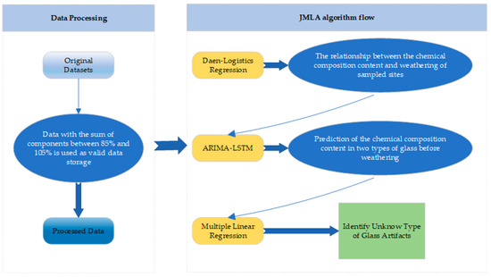 In recent years, when studying the chemical composition of ancient glass objects, the classification of glass has been mainly determined by the weight ratio of oxides or by analyzing the mass fraction of compounds containing lead and potassium [9,10,11,12,13]. However, the percentage of lead and potassium compounds present varies depending on the region where the glass was produced and the degree of weathering, which would interfere with the classification of the glass. Thereby, this study is based on the data related to ancient glassware provided by the official website of the 2022 China Student Mathematical Modeling Competition [14]. The weathering of glass over thousands of years can cause significant changes in its internal chemical composition. As a result, determining the type of glass by the amount of content in a certain chemical composition is not reliable or scientific. Therefore, based on the double adaptive elastic net improved logistic regression model (Daen-LR), ARIMA-LSTM model, and multiple linear regression model (MLR) [15,16], optimizing and combining these three algorithms, we propose a processing method and process that is suitable for classifying complex data and can be used to predict the unknown classification of glass. This process method is used to analyze and model the data related to the chemical composition and classification information of a batch of ancient Chinese glass products, to find out the correlation between their chemical composition and the basis of their classification, and to use this relationship to predict the category of unknown glass. The accuracy of the algorithm model was judged by testing the presence of heteroskedasticity in the perturbation terms, testing for multicollinearity, and testing the fit of the experimental values through the model to the actual values [17].