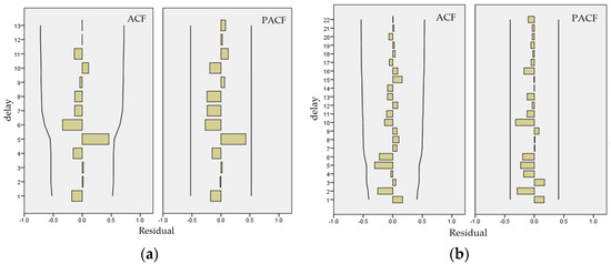 By using the ARIMA(p,d,q) model, it is possible to analyze observations at past time points, depict the intrinsic link between them, and predict future values, which is achieved based on past time values and linear error equations [28,29,30,31,32]. The ARIMA model is usually denoted as ARIMA(p,d,q), where p is the number of autoregressive terms, q is the number of sliding average terms, and d is the number of differences needed to make it a smooth series [33]. The correlogram, autocorrelation function (ACF), and partial autocorrelation function (PACF) of the time series provide information about the lags [34]. If the time series is found to be smooth, the model can be used for estimation and forecasting. However, if it is not smooth, in order to apply ARIMA, it must be transformed to be smooth by differencing. After identification, an ARIMA model is estimated for a specific smooth time series. The simple ARIMA model is estimated based on the number of effective coefficients, the Bayesian information criterion (BIC) and the Akaike information criterion (AIC), and the adjusted R2 [35]. After estimation, the selected ARIMA model needs to be diagnosed to check if the residuals are white noise. If the residuals are not white noise, the model must be re-estimated, and Q-tests and normality tests can be used to diagnose the residuals [36]. Typically, the ARIMA model is as follows: