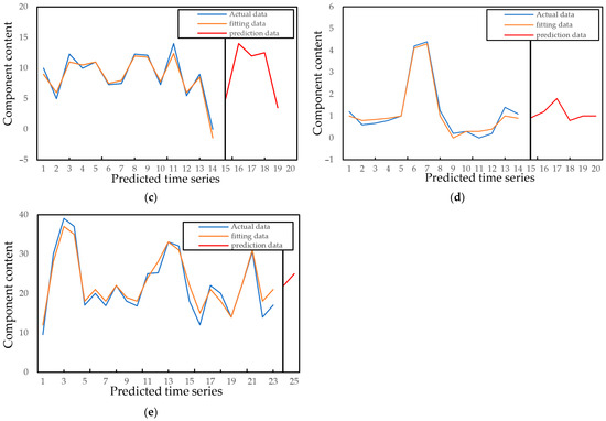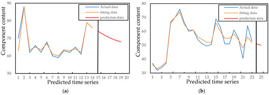 In order to deal with linear and nonlinear trends in the time series data of chemical composition content before and after weathering of cultural relics, the unique advantages of the ARIMA model in dealing with linear data and the excellent performance of LSTM in dealing with nonlinearity were used [46,47]. First, the artifact chemical content data were processed, and linear prediction results and residual series were obtained with the help of the ARIMA model. Then, the nonlinear factors of the residual series were further analyzed by the LSTM model, and the nonlinear prediction results were obtained. Finally, the linear and nonlinear prediction results were superimposed to obtain the final prediction results for the chemical composition content. According to the decomposition principle of the time series model, it is assumed that the time series consists of linear and nonlinear components . Therefore, the one-dimensional chemical component data are first linearly predicted by the ARIMA model to obtain the linear component and the residual series . Then, the residual series are processed by further nonlinear prediction to obtain the nonlinear component . Finally, the linear and nonlinear components are combined to obtain the final prediction . Root mean square error (RMSE) [48], mean absolute percentage error (MAPE), and R2 are used to evaluate the performance of the model [49,50,51,52].