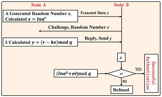 - Node B verifies x = lna^y + evmod p and whether it is established. If it is established, the authentication of node A is successful; otherwise, the access of node A is rejected, and an authentication failure message is sent to the client.