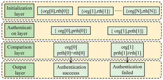 Figure 9 reflects that group authentication can be roughly divided into four layers: an initialization layer, authentication layer, comparison layer, and output layer. At the initialization layer, the initialization function is employed to save the group identity information and the corresponding rth (Root Hash) to the blockchain. The authentication layer adopts the authentication function to input the identity information of the group to be authenticated and the corresponding Present Root Hash (prth) into the system. In the comparison layer, the group identity information input in the authentication function is used to read the rth of the group and compare it with the prth. The output layer displays the results of the comparison layer. If the values are the same, authentication success is displayed. If the values are different, an authentication failure is displayed.