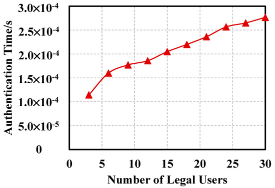 Legitimate users are only selected for authentication, as depicted in Figure 10. As the number of legitimate users increases, the time required for authentication is approximately positively correlated with the time of legitimate users. Therefore, the time cost consumed is huge when the number of authenticated users is very large.