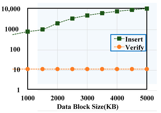 The system using Insert to write data in the blockchain during the initialization process should adopt Verify to verify the information during the verification process. Figure 13 and Figure 14 suggest that the size of the block can be controlled at 1500 KB. At this time, the system can maintain low latency while obtaining a large throughput during the initialization process and keep a good throughput during the verification process, satisfying the design requirements of the system.