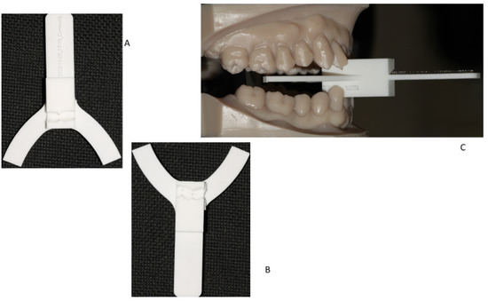 Images of the bite fork prepared for patient 2, with the indentations for upper (A) and lower (B) incisors, and positioned between the printed dental models (C).