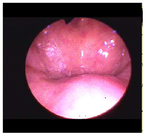 The second patient was a 57-year-old man with mild OSAS with a positional component. At the examination, the patient reported that he had been suffering from OSAS and snoring for years. Anterior rhinoscopy showed clear nasal passages, an irregular septum and bilateral inferior nasal turbinate hypertrophy. Mallampati was II–III, and the tongue, epiglottitis and mucous membranes were normal. The glottic plane was within the limits of morphology and motility, with good respiratory space and free piriform sinuses.