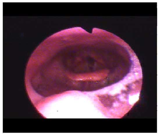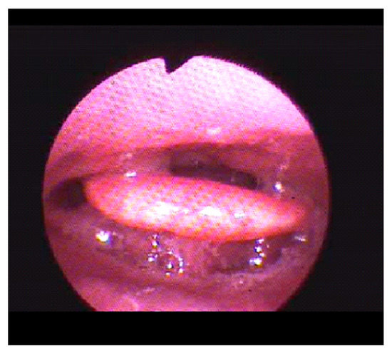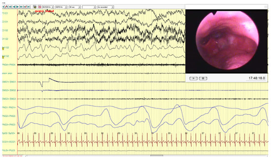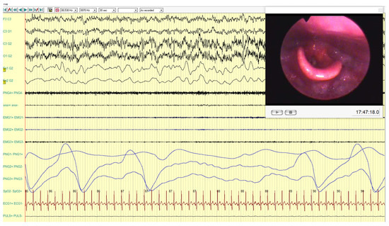 The two patients successfully underwent DISE. The procedure was performed in the operating room under the presence of an anesthesiologist, otolaryngologist, orthodontic specialist and neurophysiopathology technician. The two patients received sedation with the administration of increasing doses of propofol (3 mg/kg/h). The mean duration of the procedure was 15+/−3 min. They already prepared for polysomnography intraoperative recording, and sedation was under continuous monitoring through bispectral index (BIS) monitoring (Apect Medical Systems, Newton, MA, USA) with mean values between 50 and 70. Then, a flexible nasopharyngoscope, into the nasal cavity of 3.4 mm in diameter, was introduced to visualize and record the pattern and degree of obstruction (nasopharynx, oropharynx, hypopharynx and larynx). During DISE, in the female patient, we observed a 100% concentric retropalatal obstruction site and 75% anteroposterior epiglottis prolapsed laryngeal obstruction site (Figure 3).