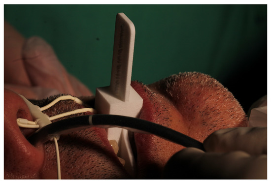 Finally, a bimanual mandibular advancement maneuver has been practiced for evaluating the degree of enlargement of the space in the sites of respiratory obstruction. With endoscopic evidence, we advanced the mandible from 4 to 5 mm by observing the positive effect on airway obstruction, snoring and oxygen saturation. The mandibular progress was then reproduced with the help of the fork: it was inserted into the mouth and the lower incisors were stuck in the groove of the lower part, which exactly reproduced their shape. Then, a front traction was performed on the fork handle, advancing the jaw until it was possible to insert the upper incisors in the groove present in the upper part, also faithfully identical to their morphology (Figure 5).